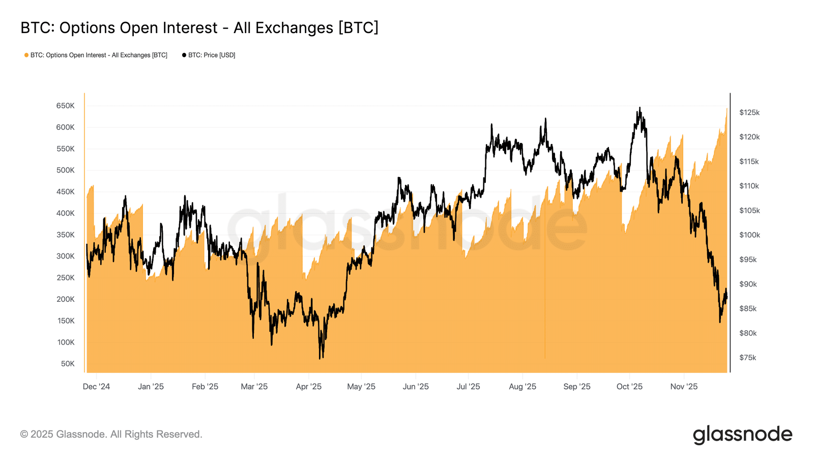 Ostatni wzrost zmienności zwiększył aktywność na rynku opcji. Połączenie strategii arbitrażu zmienności oraz rosnącego zapotrzebowania na zarządzanie ryzykiem … Doprowadziło do rekordowego poziomu otwartych pozycji w opcjach denominowanych w BTC. Warto podkreślić, że dotyczy to wyłącznie kontraktów w BTC w ujęciu USD. Ilościowo otwartych pozycji nadal jest znacznie mniej niż w szczycie z końca października, gdy Bitcoin znajdowal się rejonie 110 tys. USD.