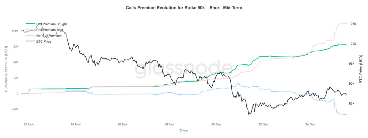 Dane z przepływów potwierdzają ten obraz. Sprzedaż premii call przewyższała jej zakup, mimo że cena stopniowo rosła. Uczestnicy wykorzystują odbicie do sprzedaży premii i zbierania carry, zamiast angażować się w dalszy ruch w górę. Ostatni wzrost złagodził krótkoterminową panikę, ale nie rozwiązał głębszej, strukturalnej słabości rynku.