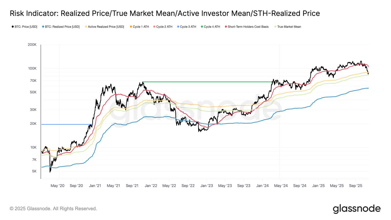 Bitcoin od początku października pozostaje poniżej ceny wejścia krótkoterminowych inwestorów (plus minus 104,5 tys. USD). To wprowadza rynek w strefę wyraźnego niedoboru płynności i osłabionego popytu. Obecnie cena testuje ważny zakres strukturalny, wyznaczany przez Active Realized Cap Price (średnią cenę wszystkich nieuśpionych BTC) oraz True Market Mean. Ten drugi wskaźnik odzwierciedla BTC nabyte na rynku wtórnym.