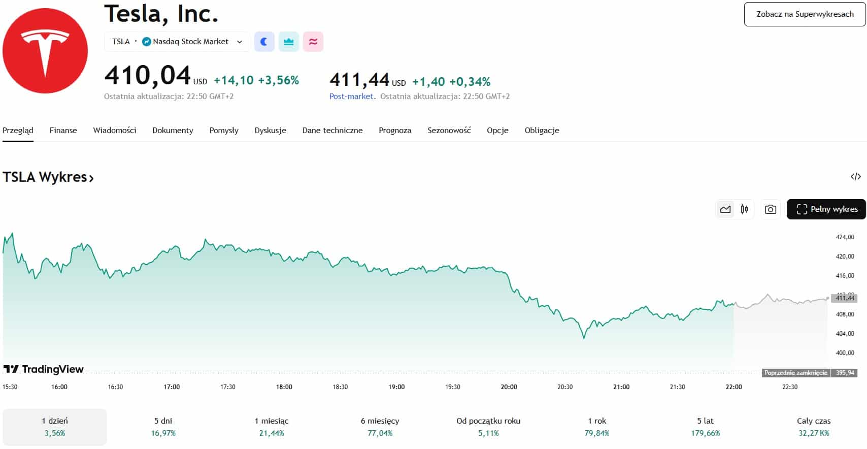 Tymczasem wczoraj spółka mocno odbiła. Skok był na tyle silny, że TSLA zniwelowała wszystkie straty z tego roku. W poniedziałek akcje firmy kosztowały około 410 dolarów za sztukę, a w ujęciu 24-godzinnym wzrosły o 3,56%. Przez ostatni tydzień spółka wzrosła aż o 16,97%. Z kolei przez ostatni miesiąc zyskała 21,44%