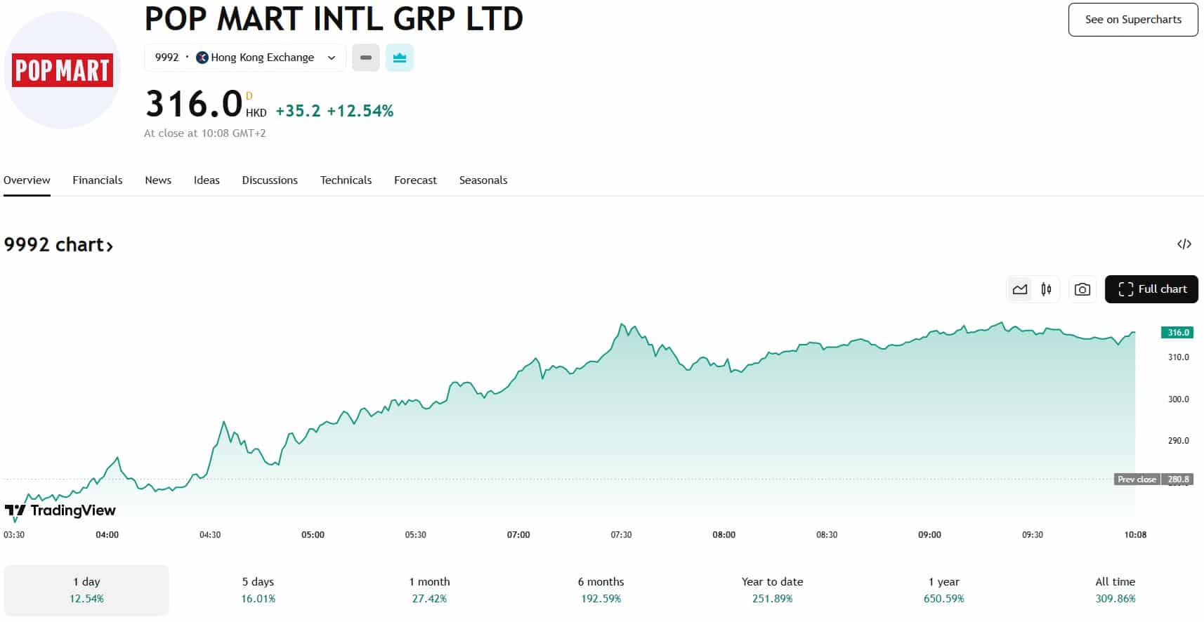 Po publikacji danych spółka Akcje Pop Mart zyskała na giełdzie w ciągu chwili aż 10%. Jej wyniku od początku roku są jeszcze lepsze. W momencie pisania tekstu za jedną akcję firmy trzeba zapłacić 316 HDK (około 40,30 USD). W ujęciu 24-godzinnym akcje podmiotu wzrosły o 12,54%. Natomiast w trakcie ostatniego tygodnia i miesiąca spółka zyskała na wartości odpowiednio 16,01% oraz 27,42%. Od początku roku Pop Mart wzrósł na giełdzie aż o 251,89%.
