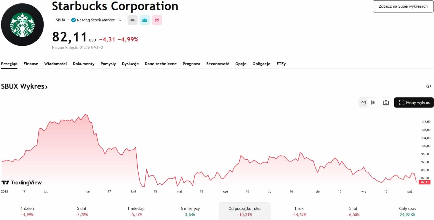 Niepokojąco wygląda również wskaźnik YTD (Yeard To Date), który pokazuje, jak podmiot radził sobie na giełdzie w trakcie roku. Od początku 2025 roku Starbucks stracił na wartości 10,31%.