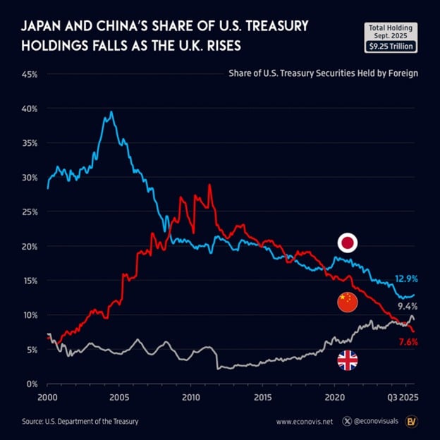 Chiny do niedawna dominowały na rynku obligacji USA. Jednak od 2011 roku ich udział zmniejszył się o aż 20 punktów procentowych, a we wrześniu 2025 roku osiągnął zaledwie 7,6%, co zepchnęło Pekin na trzecie miejsce wśród zagranicznych inwestorów. Japonia póki co utrzymuje pozycję lidera z 12,9% udziałem, ale nawet i Tokio stopniowo ogranicza zakupy, wpisując się w szerszy już trend w politykach azjatyckich banków centralnych. Co to oznacza? Rynek staje się bardziej podatny na wahania. Inwestorzy prywatni zastępują stabilne banki centralne, co zwiększa zmienność w okresach stresu ekonomicznego.