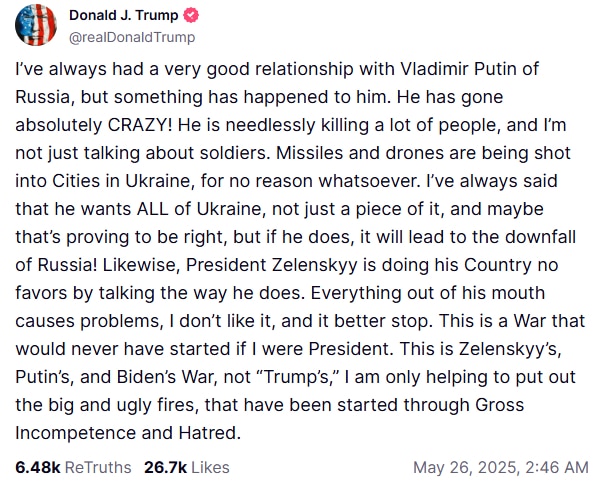 „Coś się z nim stało. Putin całkowicie OSZALAŁ!” – napisał Trump. – „Zawsze mówiłem, że on chce całej Ukrainy, a nie tylko jej części. Jeśli naprawdę tak jest, doprowadzi to do upadku Rosji”