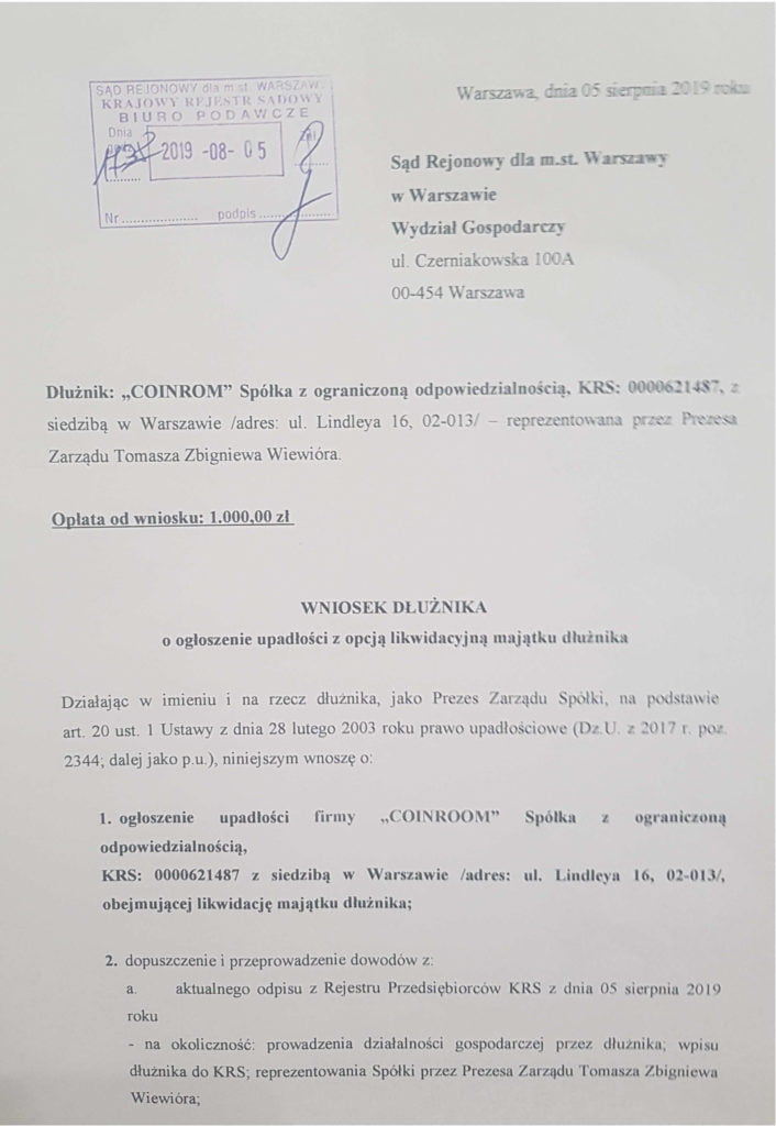 Po blisko 6 tygodniach biurokratycznej batalii Coinroom wystosował oficjalny wniosek o ogłoszenie upadłości z opcją likwidacji majątku spółki.