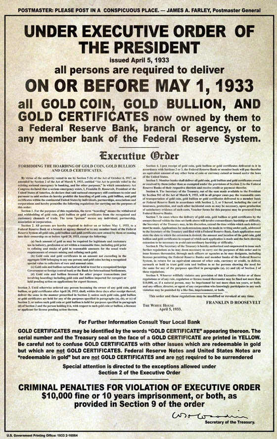 Tymczasem nadszedł Wielki Kryzys. W jego wyniku, od 1934 r. Amerykanom zabroniono posiadać dużych ilości złota bulionowego na własny użytek. Wyjątkiem była biżuteria i niektóre kolekcje numizmatyczne. W 1933 i dalej w 1934 r. w USA dokonano nacjonalizacji złota, skupiono je od obywateli za ustaloną cenę ok. 20 USD za uncję, po czym z automatu podwyższono cenę rynkową złota do 35 USD za oz.