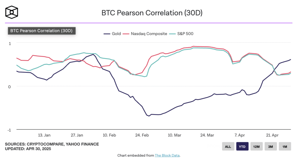 Bitcoin i złoto – dwa aktywa, które często porównuje się w kontekście ochrony kapitału – znów zaczynają się ze sobą synchronizować. Najnowsze dane pokazują, że 30-dniowy współczynnik korelacji Piresona między nimi wzrósł do poziomu 0,54, zbliżając się do rocznego maksimum 0,73. Czy oznacza to, że Bitcoin znów zyskuje reputację cyfrowego złota?