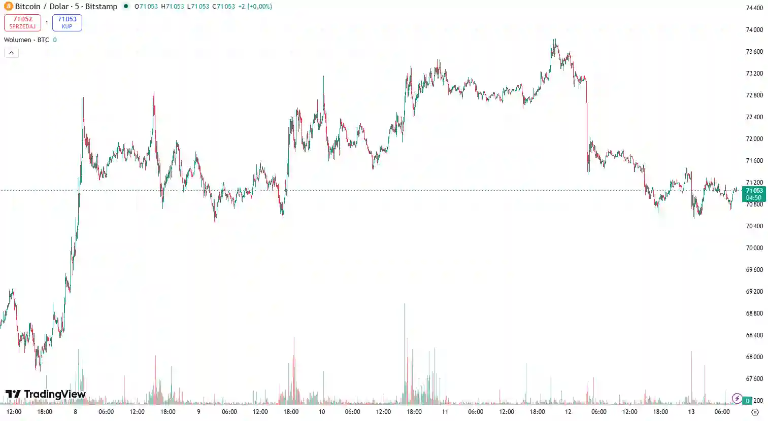 Jeszcze wczoraj rynek żył nadziejami na kontynuację wzrostów mimo trwającego ryzyka geopolitycznego, jednak zaledwie szesnaście godzin później wykres mówi wyraźne sprawdzam. Aktualna cena oscyluje w granicach 71 051 USD, co oznacza bezpośrednie zderzenie z kluczowym poziomem oporu.