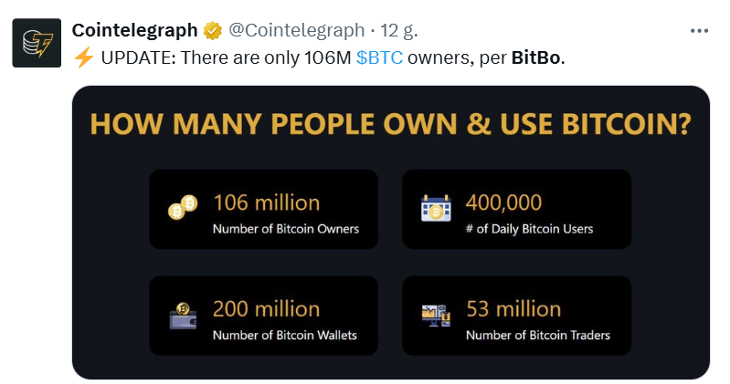 Według najnowszego raportu BitBo, na całym świecie Bitcoina posiada zaledwie 106 milionów ludzi. Nie miliard. Nie pół miliarda. Sto sześć milionów. kropla w morzu, jeśli porównać to z populacją globu liczącą ponad 8 miliardów ludzi. I tu zaczyna się robić naprawdę ciekawie.