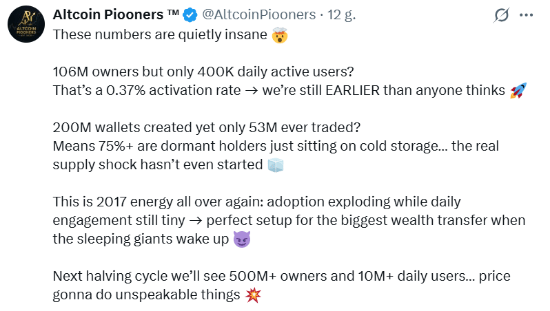 Portfeli? Około 200 milionów, ale oczywiście wiele z nich to wirtualne wydmuszki, testowe adresy, multisigi i trzymanie BTC w szufladzie od lat. Prawdziwych traderów? 53 miliony. To znacznie mniej niż liczba ludzi śledzących tweety Elona Muska przed poranną kawą. Te dane spalają narrację, którą lubią snuć krytycy: że Bitcoin „jest już wszędzie” i „nie ma już komu kupować”. Jest dokładnie odwrotnie.