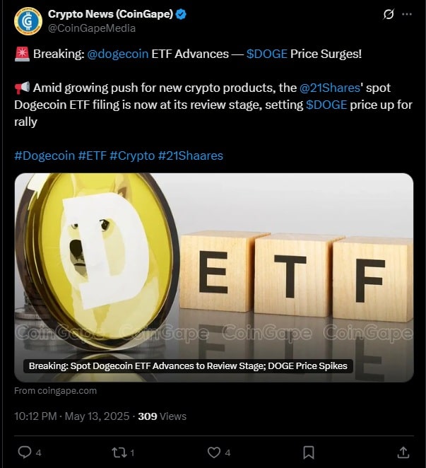 Jako pierwszy, w połowie stycznia, swój wniosek o DOGE ETF złożył REX Shares & Osprey. Zaledwie kilka godzin później pojawił się drugi wniosek o DOGE ETF. Formularz złożyła firma Bitwise. Amerykańska Komisja Papierów Wartościowych i Giełd (SEC) otrzymała wniosek od firmy Grayscale. W kolejce po ETF powiązany z tym memecoinem ustawił się również 21Shares.