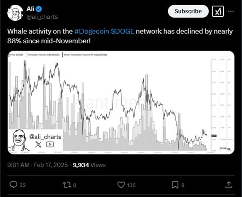 Straty są spore, ale porównywalne do pozostałych monet na rynku. Jednak kilka czynników sugerują, że to może być dopiero początek prawdziwej katastrofy. Niepokojąco wyglądają przede wszystkim dane dotyczące aktywności duży posiadaczy. Jak poinformował Ali Martinez w jednym z ostatnich postów na X, aktywność wielorybów w sieci Dogecoin spadła o prawie 88% od połowy listopada.