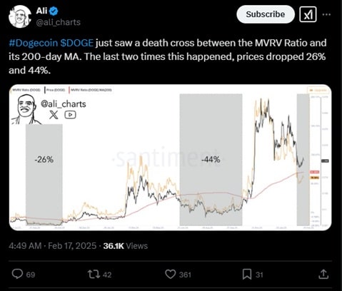 Dodatkowo Martinez przedstawił na X wyniki swojej analizy technicznej. Wynika z niej, że obecnie na wykresie Dogecoina formuje się „śmiertelne skrzyżowanie współczynnika MVRV z jego 200-dniową MA”. Jak ustalił ekspert, gdy DOGE w przeszłości podążał podobną ścieżką, jego cena spadała o 26% i 44%.