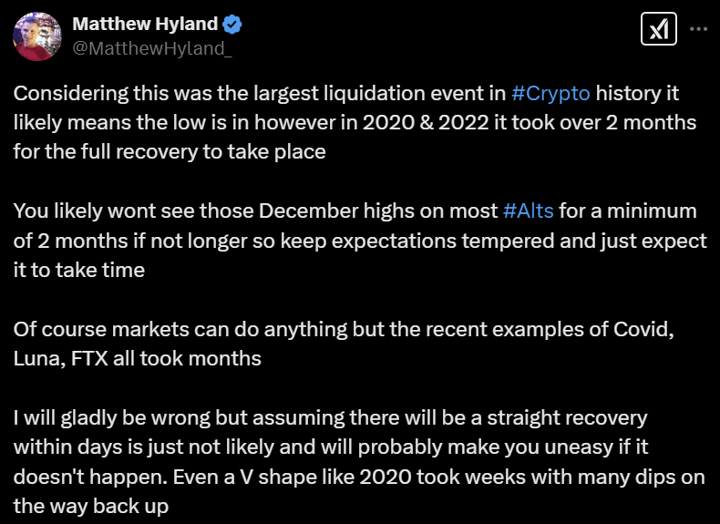 Według analityka Matthewa Hylanda pełne odbicie rynku może nastąpić dopiero w kwietniu. Porównał on obecną sytuację do poprzednich krachów z lat 2020 i 2022.