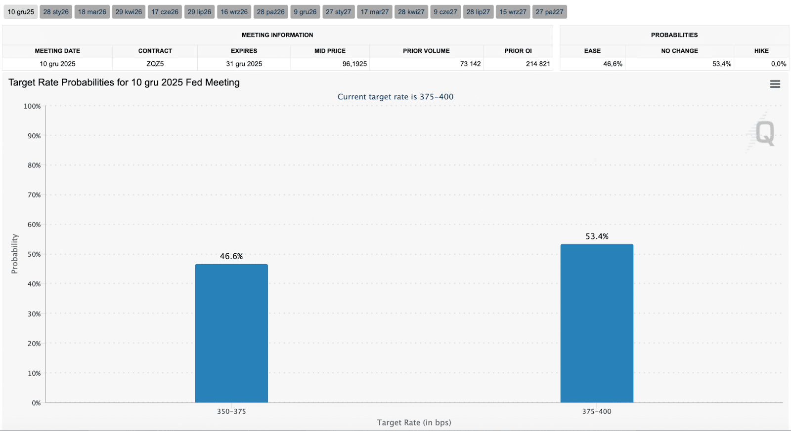 Aktualnie oczekiwania stały się bardziej ostrożne, a szanse na kolejną obniżkę stóp procentowych w grudniu spadły w okolice 46%, zgodnie z danymi z CME FedWatch.