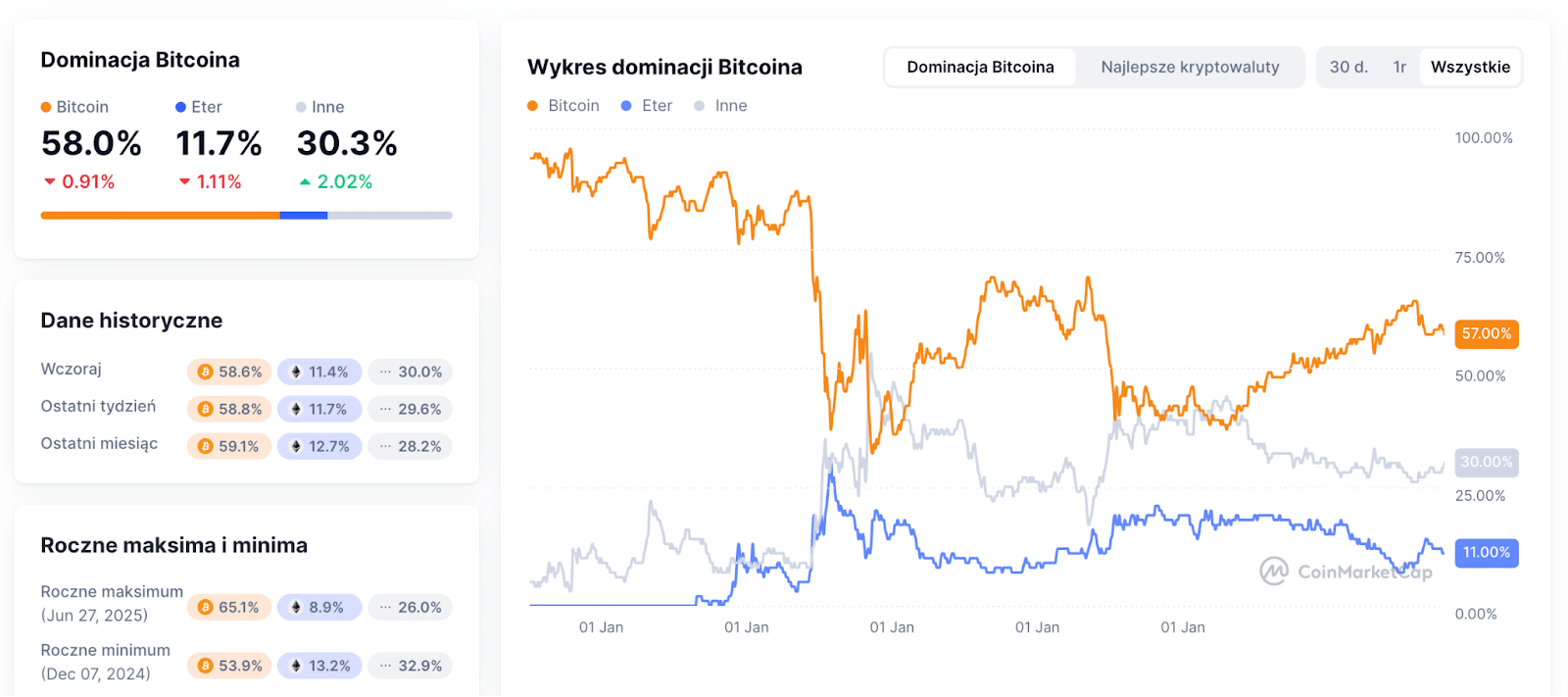 Na poziomie całego rynku zmianę nastrojów dobrze widać na wykresach dominacji Bitcoina. Dane z CoinMarketCap pokazują, że udział BTC w łącznej kapitalizacji rynku kryptowalut utrzymuje się wciąż na podwyższonym poziomie, co oznacza, że kapitał nadal preferuje główne aktywo kosztem altcoinów.