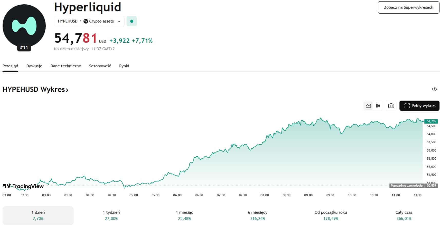 Token znowu wykonał rajd i to od razu po nowe ATH, które od teraz wynosi blisko 55 dolarów. W chwili pisania tekstu token wciąż utrzymuje dynamikę wzrostu i kosztuje 54,78 USD. Tylko w ciągu ostatniej doby altcoin zyskał 7,70%. Z kolei w ujęciu tygodniowym zanotował wzrost o 27%. W trakcie ostatniego miesiąca kryptowaluta wzrosła o 25,48%. Od początku roku HYPE zyskał na wartości już blisko 130%.