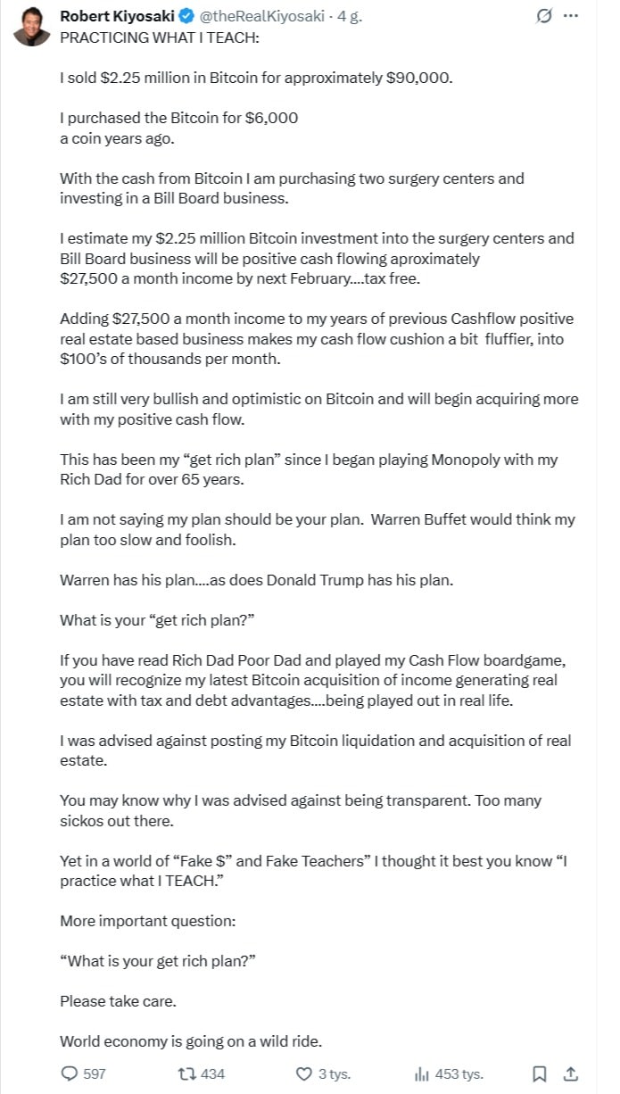 Pieniądze ze sprzedaży kryptowaluty mają zasilić dwa posiadane przez Kiyosakiego „centra chirurgiczne” oraz przedsiębiorstwo zajmujące się powierzchniami reklamowymi. Kiyosaki szacuje, że ta inwestycja, stanowiąca kwintesencję jego nauki o budowaniu aktywów generujących dochód, przyniesie mu 27 500 dolarów miesięcznego, nieopodatkowanego dochodu do lutego 2026 roku. Ta decyzja idealnie wpisuje się w jego główną tezę z „Bogatego ojca, biednego ojca”: to przepływ gotówki jest najważniejszy, a aktywa powinny pracować, by generować pieniądze, za które można kupować kolejne aktywa. W rzeczywistości Kiyosaki zapowiedział, że pozostaje niezwykle optymistyczny co do przyszłości Bitcoina i zamierza zacząć go ponownie nabywać właśnie za gotówkę wygenerowaną z nowo wzmocnionych przedsięwzięć biznesowych. W ten sposób zrealizował pokoleniowy zysk, a jednocześnie zgodnie ze swoją strategią uniezależnił się od wahań jednego aktywa, budując stabilny dochód pasywny, który w przyszłości posłuży do akumulacji BTC na większą skalę.