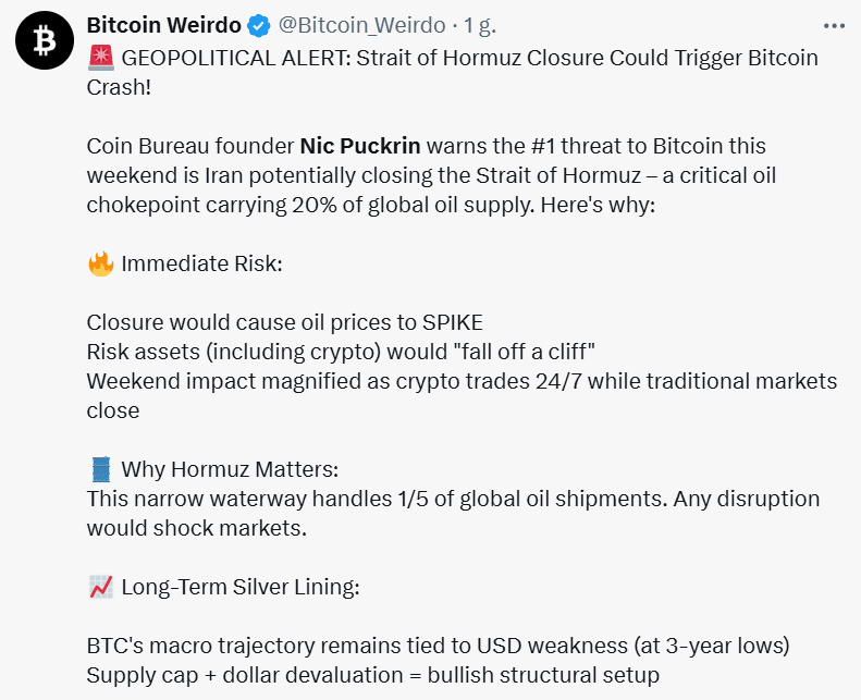 „Największe ryzyko dla rynku? Jeśli Iran zamknie Cieśninę Hormuz” – pisze Nic Puckrin z Coin Bureau. I dodaje, że przez ten wąski korytarz płynie niemal 20% światowego handlu ropą. Jeśli dojdzie do jego blokady, ceny ropy wystrzelą, a tzw. „risk assets” – czyli ryzykowne aktywa, w tym kryptowaluty – „spadną z klifu”.
