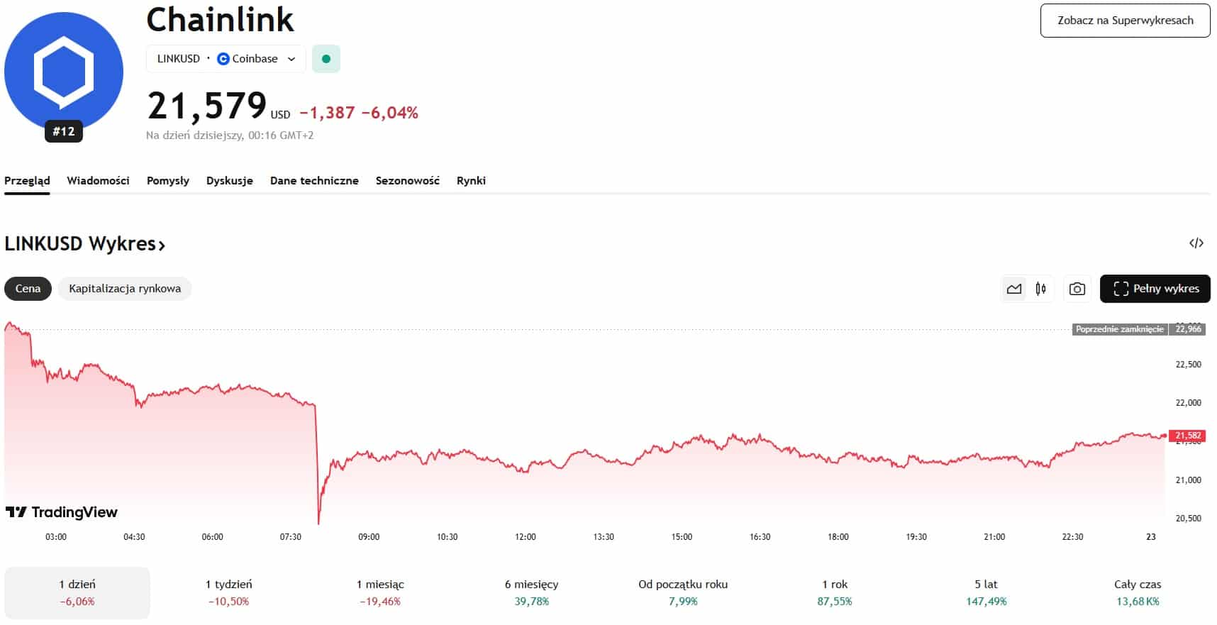 Dość boleśnie ostatnie zawirowania rynkowe odczuł Chainlink. Altcoin w chwili pisania tekstu kosztuje 21,57 USD, a w ciągu ostatnich 24 godzin spadł o 6,06%. W ujęciu tygodniowym altcoin stracił aż 10,50%. Jeszcze gorzej wyglądają wyniki za ostatnie 30 dni. W trakcie ostatniego miesiąca token spadł o 19,46%. Pomimo mocnego zjazdu wciąż na zielono pali się wskaźnik YTD (Year To Date). Od początku roku LINK zyskał na wartości 7,99%.