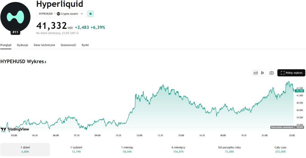 W chwili pisania tekstu token kosztuje 41 dolarów i tylko w ciągu ostatnich 24 godzin wzrósł o 6,80%. Jeszcze lepszy był miniony tydzień, w trakcie którego HYPE zyskał na wartości 13,47%. Natomiast przez cały ostatni miesiąc token wzrósł aż o 58,04%. Hyperliquid jest również jedną z niewielu monet, które w tym roku rosną. Od początku roku altcoin zyskał na wartości 73,08%. W tym samym czasie zdecydowana większość kryptowaluta notuje straty, a ich posiadacze mogą tylko pomarzyć o takich wynikach.