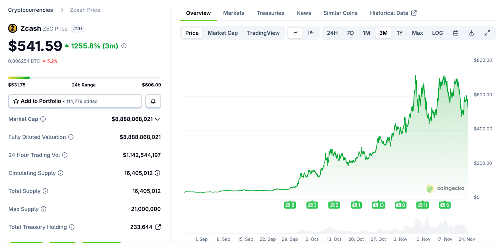 Dobrym przykładem takiej rotacji jest Zcash. Gdy Bitcoin tonie w czerwieni, $ZEC notuje wzrosty. W ostatnich tygodniach kurs wspiął się o blisko 100 procent w skali miesiąca, a w ostatnich trzech miesiącach ruch w górę sięgnął ponad 1200 procent, zgodnie z danymi CoinGecko.