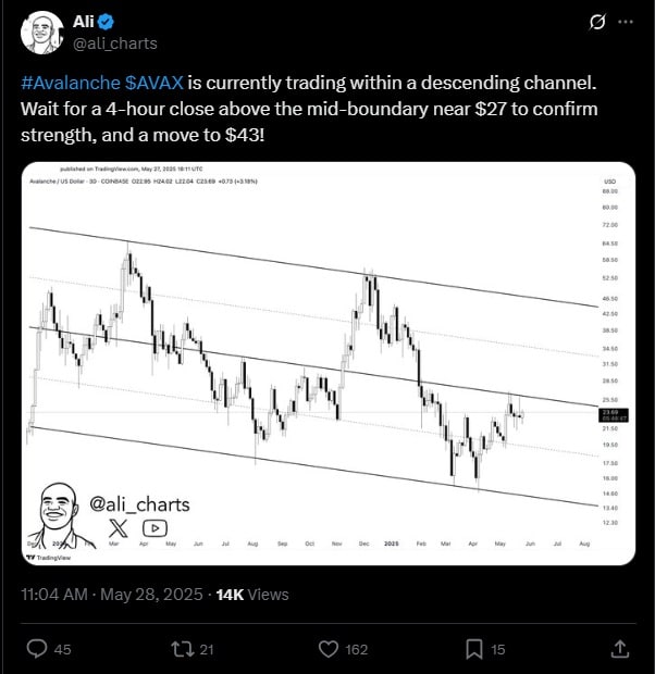 Zatem AVAX nie wygląda jak kandydat do silnego wybicia. Jednak Ali Martinez ocenia, że moneta może sprawić niespodziankę. W jednym z najnowszych postów na X popularny ekspert przedstawił wykres. Martinez sądzi, że Avalanche jest obecnie notowany w kanale spadkowym. Jednak zamknięcie powyżej środkowej granicy w pobliżu 27 USD, zdaniem eksperta, będzie sygnałem zwiastującym silny ruch w górę. Martinez sądzi, że celem są nawet 43 dolary. Realizacja takiego planu oznaczałaby wzrost wartości o blisko 50%.