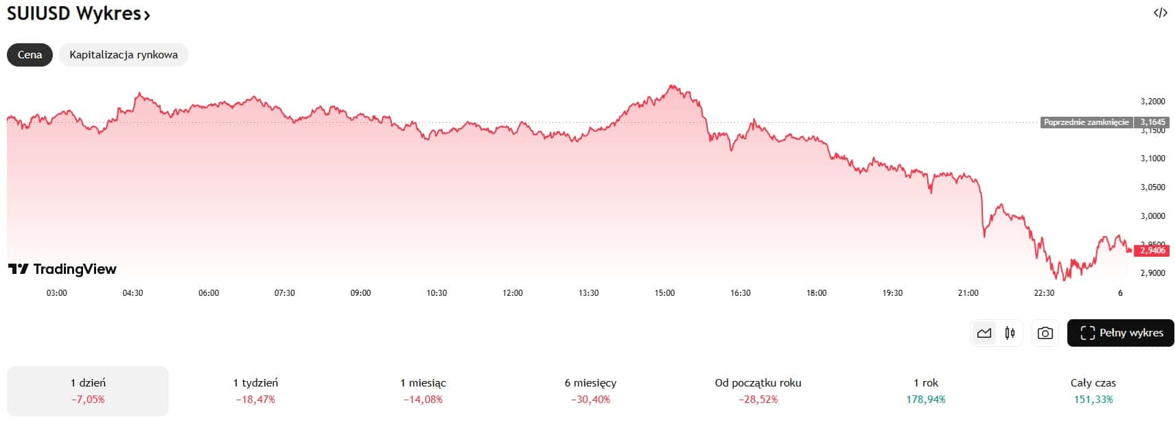 Altcoin, który jest tuż za plecami TOP 10, od dłuższego czasu radzi sobie wyraźnie gorzej. W momencie pisania tekstu SUI kosztuje 2,94 USD i tylko w ciągu ostatnich 24 godzin spadł o 7,18%. Jeszcze gorzej było w trakcie ostatniego tygodnia, gdy altcoin stracił na wartości 18,47%. Natomiast przez ostatni miesiąc projekt spadł o 14,08%. Od początku roku moneta zanurkowała o blisko 30%.
