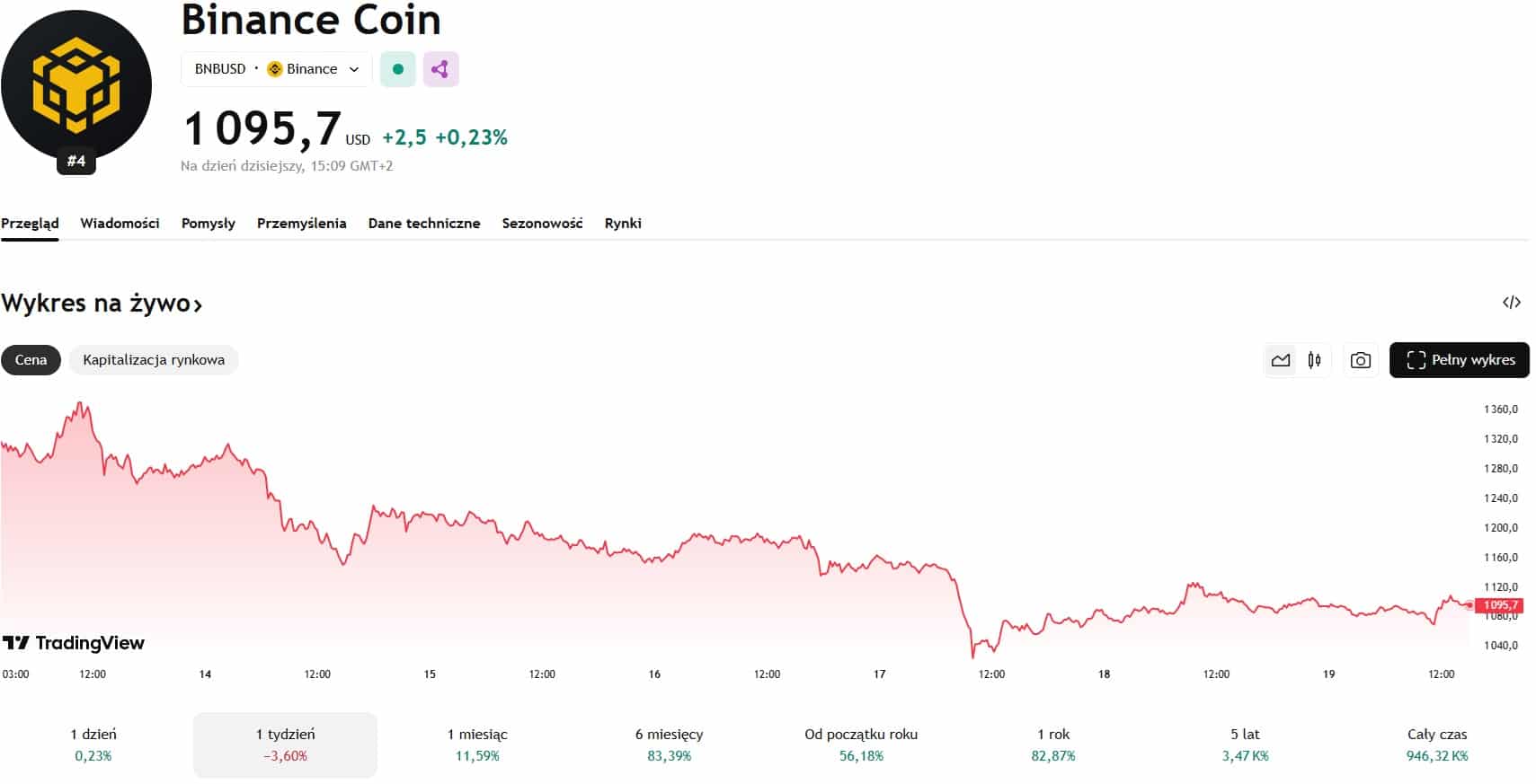 Od kilku dni BNB jest w odwrocie, a w chwili pisania tekstu kosztuje 1079 USD. W ujęciu 24-godzinnym moneta nie wykonała żadnego istotnego ruchu (0,23%). Przez cały ostatni tydzień Binance Coin spadł o 3,60%. Natomiast w ujęciu miesięcznym altcoin wciąż utrzymuje wzrost (11,59%). Pomimo ostatnich spadków moneta ma wciąż imponujący wskaźnik YTD (Year To Date). Od początku roku token zyskał na wartości 56,18%.