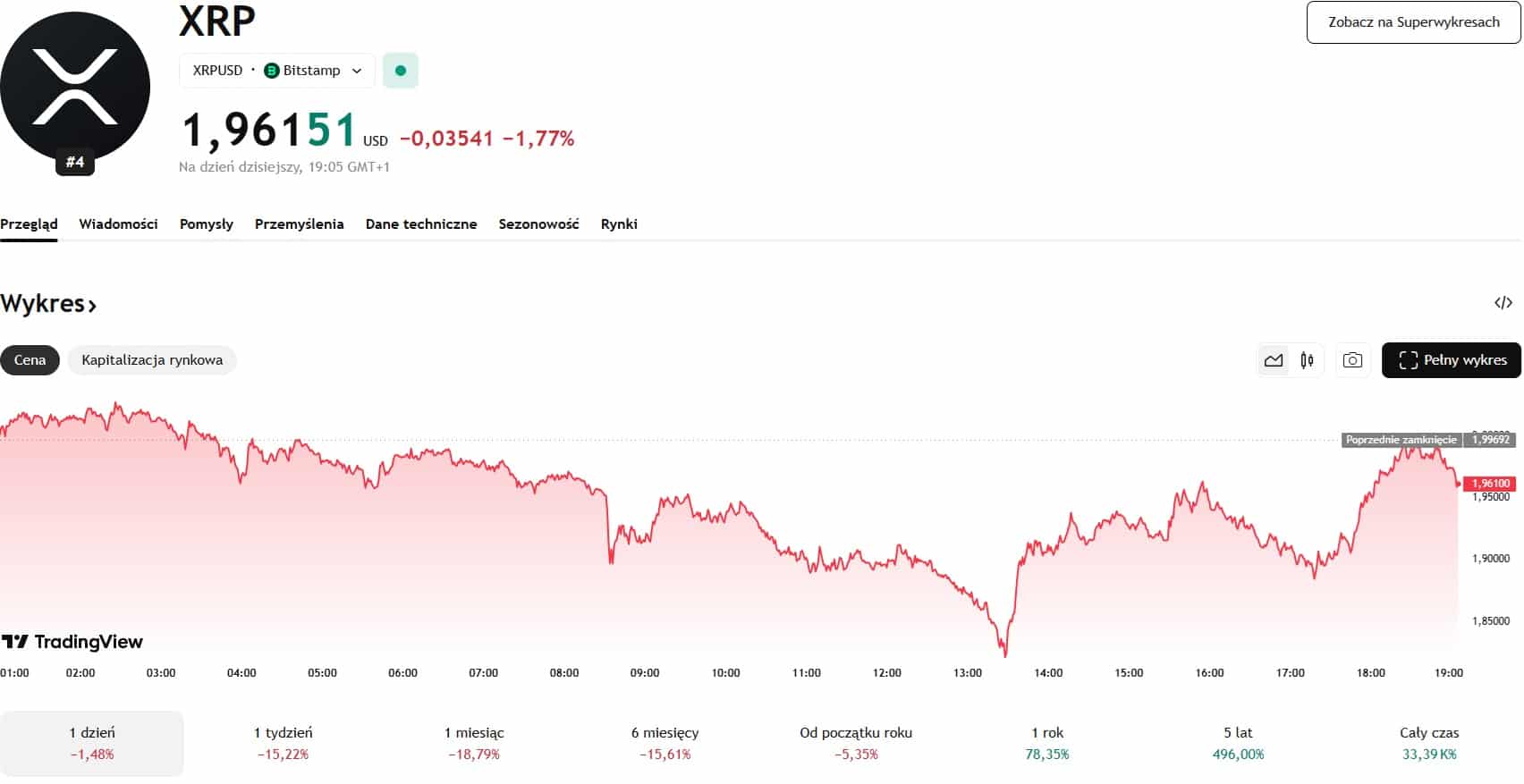 W ostatnich dniach XRP podążą śladami Bitcoina i mocno traci na wartości. W chwili pisania tekstu altcoin kosztuje 1,96 USD, a w ciągu ostatnich 24 godzin stracił około 1,48%. To kiepski wyniki, ale w krytycznym momencie token kosztował 1,82 USD. W ujęciu tygodniowym strata wynosi 15,22%. Natomiast przez cały ostatni miesiąc moneta spadła o 18,79%. Przez długi czas XRP wyróżniał się tym, że miał dodatni wskaźnik YTD (Year To Date). Jednak to już przeszłość. Na ten moment token od początku roku traci na wartości 5,35%.