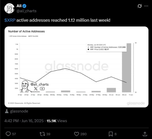 Jednak po tygodniach stagnacji wreszcie widać wyraźne oznaki poprawy. Aktywność w sieci Ripple zdecydowanie wzrosła. W ciągu ostatniego tygodnia średnia liczba aktywnych użytkowników dziennie wyniosła 295 tys. To kilkukrotny wzrost z poziomu 35-40 tys., który notowano w ciągu ostatnich trzech miesięcy. Z danych Glassnode, które opracował Ali Martinez, wynika, że tylko w ciągu całego minionego tygodnia sieć XRP osiągnęła 1,12 mln aktywnych adresów.