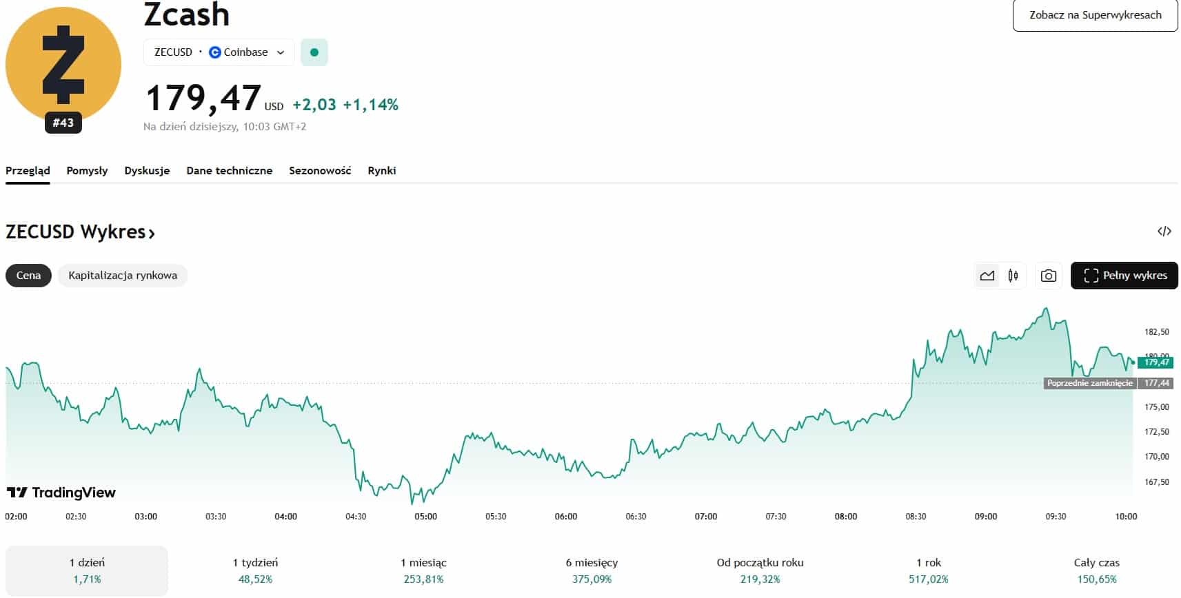 Po latach zapomnienia na nagłówki największych portali branżowych wrócił Zcash, który w ostatnich dniach zanotował ogromny wzrost. W chwili pisania tekstu token kosztuje 179 USD i tylko w ciągu ostatnich 24 godzin wzrósł o 1,71%. Z kolei przez cały poprzedni tydzień altcoin zyskał na wartości aż 48,52%. Jeszcze lepiej jest, gdy spojrzymy na ostatni miesiąc. W tym okresie Zcash wzrósł aż o 253,81%. Od początku roku moneta zyskała na wartości aż 219,84%.