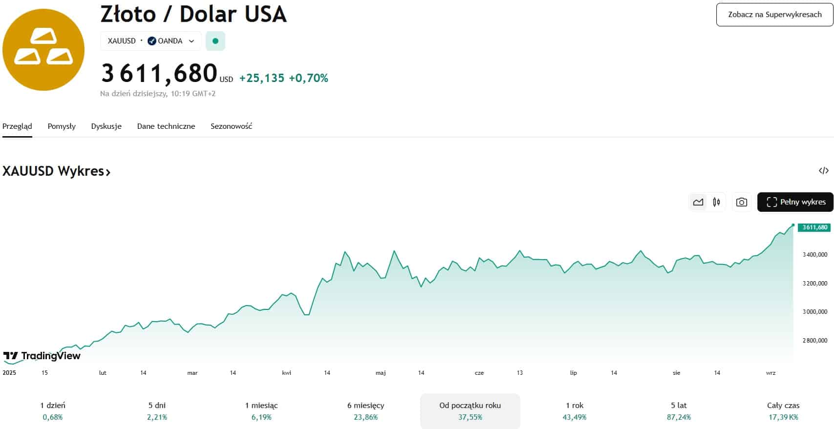 W ostatnich miesiącach złoto potwierdza, że ta opinia nie jest przesadzona. Niedawno metal przekroczył barierę 3600 dolarów za nujcję, czym poprawił rekord z kwietnia. Wówczas cena złota osiągnęła 3500 dolarów. Na początku tygodnia dynamika wzrostów znowu przyspiesza.