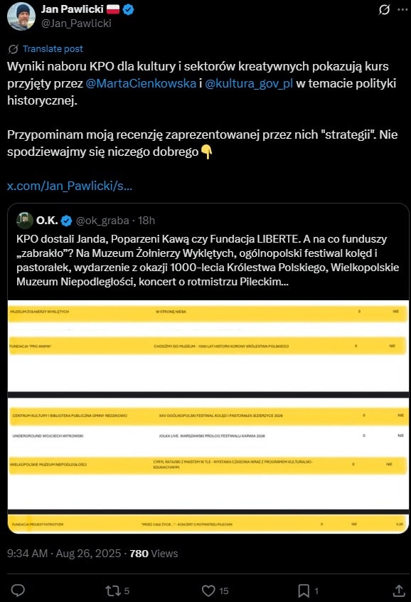 Podobnie jak w przypadku KPO dla HoReCa pojawiły się również zarzuty dotyczące braku dofinansowania dla pomysłów, które na tle tych z dofinansowaniem, wyglądają na sensowne i uzasadnione. Użytkownicy X zwracają uwagę, że Ministerstwo Kultury i Dziedzictwa Narodowego nie przyznało grantów na takie projekty jak np: