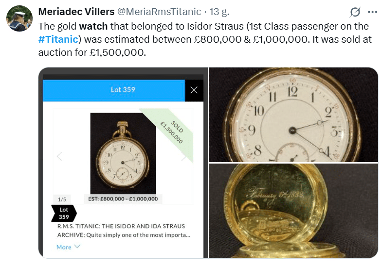 Zegarek został w rodzinie Strausów przez pokolenia. Przekazywano go jak relikwię. Ostatecznie trafił pod młotek po tym, jak Isidor Straus IV zdecydował o jego sprzedaży. Wcześniej poddał go konserwacji i przywróceniu mechanizmu do życia. Choć tarcza wciąż wskazuje godzinę katastrofy.