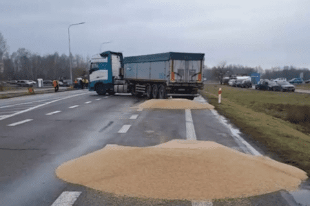 Protestujący odmówili ich przepuszczenia, następnie zaś otworzyli naczepy ciężarówek. W sposób tyleż oczywisty, co logiczny – choć w komunikacie opisane nieomal jako fenomen natury – zboże wysypało się w ten sposób na ulicę.