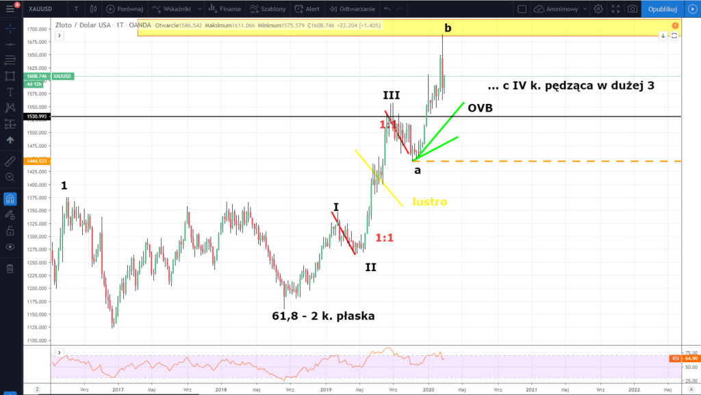 Złoto, zgodnie ze scenariuszem z poprzednich analiz, dotarło do strefy oznaczonej kolorem żółtym i po zakończeniu wewnętrznej fali -b, korekty pędzącej w fali 4 wyższego rzędu nastąpiła bardzo silna reakcja podaży. Tak silna, że na interwale dziennym wykresu pojawiała się formacja objęcia bessy. Ja jednak nie uznaję tej formacji.