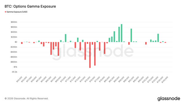 Z perspektywy struktury rynku bardzo ważną rolę w krótkim terminie odgrywa dziś pozycjonowanie dealerów. W przedziale 74–76 tys. USD widoczna jest duża koncentracja ujemnej gammy, a ekspozycja ulokowana powyżej ceny spot sięga około 3 mld USD. To tworzy strefę, w której przepływy hedgingowe mogą realnie wpływać na kierunek ruchu.