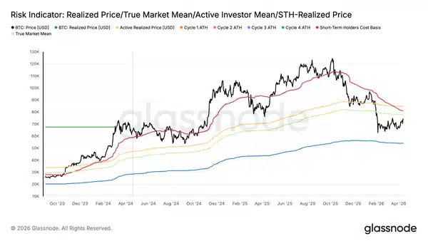 Ponieważ kurs wciąż konsoliduje się poniżej poziomu True Market Mean, zachowanie inwestorów krótkoterminowych pozostaje jednym z najlepszych wskaźników pokazujących, gdzie wzrostowe odbicia w rynku niedźwiedzia mogą zacząć wygasać.