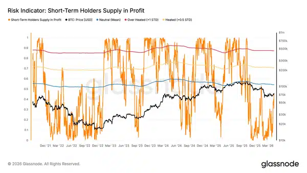 Wskaźnik Percent of Short-Term Holder Supply in Profit pokazuje, jaka część niedawno nabytej podaży znajduje się obecnie na niezrealizowanym zysku. Innymi słowy, mierzy on skalę potencjalnej presji sprzedażowej ze strony nowych uczestników rynku. Historycznie lokalne szczyty w trakcie rajdów w bessie często pojawiały się wtedy, gdy ten odczyt zbliżał się do swojej średniej statystycznej wynoszącej około 54%. To właśnie w tym rejonie udział krótkoterminowych posiadaczy będących na plusie stawał się na tyle duży… Że zaczynała się wyraźniejsza dystrybucja.