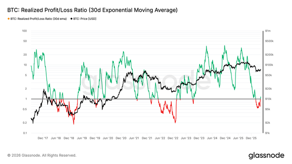 Patrząc szerzej na dynamikę rynku, sam obraz krótkoterminowego wyczerpania to za mało. Żeby lepiej ocenić kondycję trendu, trzeba sprawdzić relację między realizowanymi zyskami i stratami w całej bazie inwestorów. Do tego służy Realized Profit/Loss Ratio, który pokazuje, jaka jest wartość dolarowa zysków realizowanych na każdy 1 dolar zrealizowanej straty. W tej analizie używana jest 30-dniowa EMA, aby ograniczyć krótkoterminowy szum i lepiej uchwycić dominujący trend.