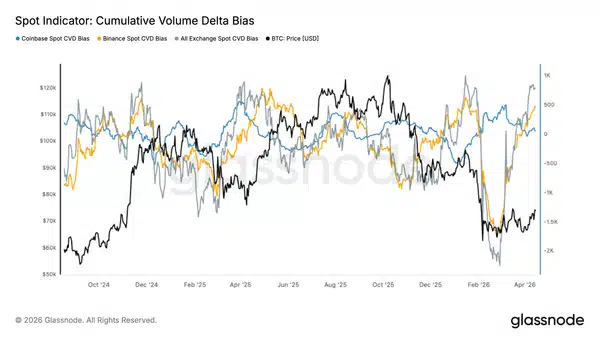 Najmocniej odbicie napędzają przepływy na Binance, co może sugerować powrót aktywności ze strony segmentu offshore i inwestorów detalicznych. Z kolei Coinbase CVD pozostaje stosunkowo słaby, co wskazuje na bardziej ostrożny powrót uczestników instytucjonalnych. Ta rozbieżność ma znaczenie, bo trwałe ruchy wzrostowe zwykle potrzebują szerszego udziału obu tych grup.
