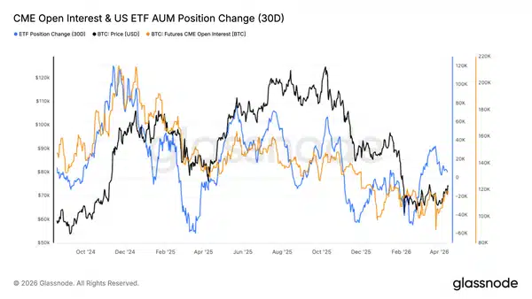 Mimo to skala tego odbicia nadal pozostaje umiarkowana. Open interest na CME wciąż znajduje się wyraźnie poniżej wcześniejszych szczytów, a napływy do ETF-ów nie mają jeszcze tej ciągłości i dynamiki, która była widoczna w poprzednich etapach cyklu. To bardziej obraz ostrożnego odbudowywania pozycji niż pełnego przejścia rynku w tryb risk-on.