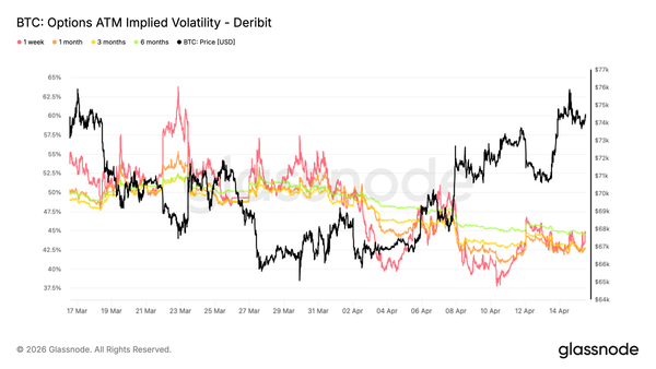 Struktura terminowa pozostaje stosunkowo płaska. Zmienność 1-miesięczna znajduje się nieco poniżej 3-miesięcznej, na poziomie około 42,6%. To sugeruje brak pilnej potrzeby zabezpieczania ryzyka w krótkim terminie. Taka kompresja wskazuje, że ostatnie napięcia geopolityczne nie są już postrzegane jako czynnik, który mógłby wywołać długotrwałą turbulencję na rynku. Zamiast tego rynek opcji stopniowo przechodzi w kierunku bardziej stabilnych warunków, mimo że niepewność makroekonomiczna wciąż nie została rozwiązana.