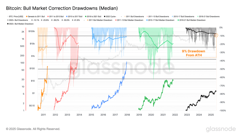Gdyby spojrzeć na korektę jako procentowe cofnięcie od historycznego szczytu, wyniosła ona zaledwie -9%. Co istotne, w 384 z 928 dni handlowych tego cyklu (czyli w 41,4% przypadków) rynek doświadczał głębszych spadków. Obecny ruch spadkowy niemal idealnie wpisuje się też w medianę korekt dla tego cyklu, wynoszącą 7%. To sugeruje, że z perspektywy cenowej, skala tej korekty była całkowicie zgodna z dotychczasowym zachowaniem rynku.