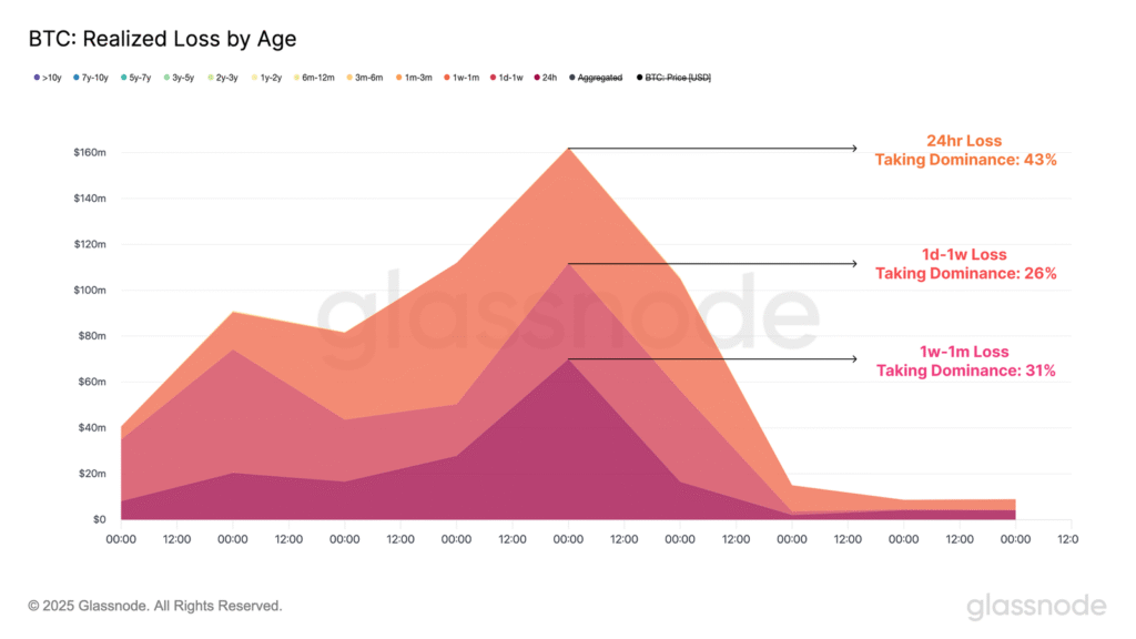 Zaglądając głębiej w strukturę zrealizowanych strat, widać wyraźnie, że ich źródłem byli niemal wyłącznie nowi uczestnicy rynku. To inwestorzy z krótkim stażem – głównie ci, którzy kupowali blisko szczytów – ponieśli największe straty w trakcie ostatniej korekty.