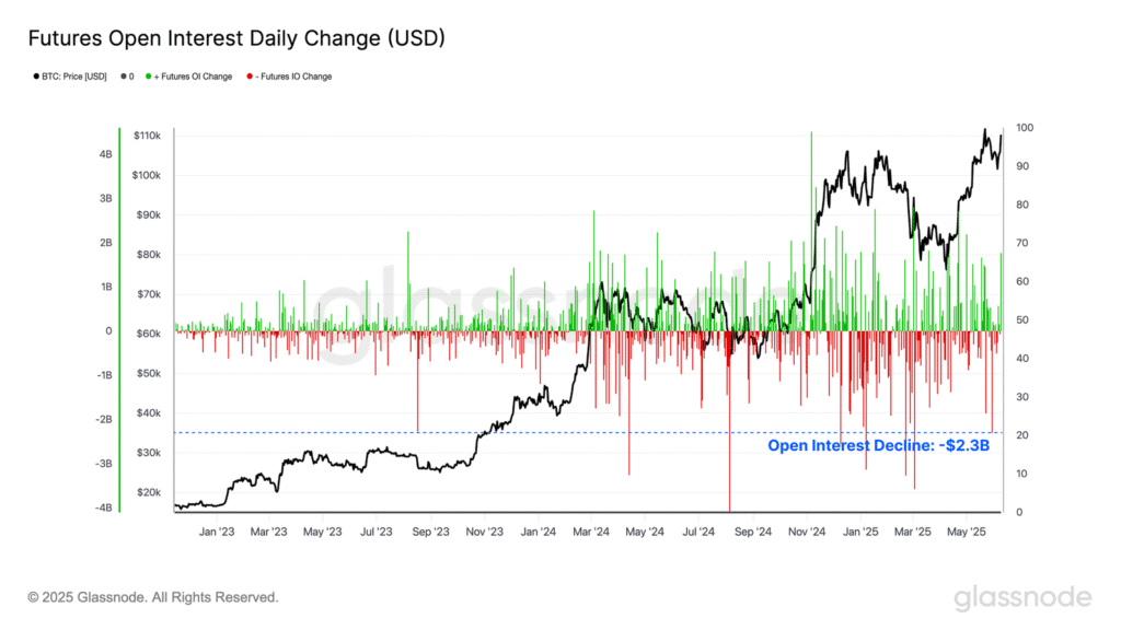 Jednak istotny spadek otwartych pozycji miał miejsce na rynku kontraktów futures. Zlikwidowano lub wycofano pozycje o łącznej wartości ponad -2,3 mld USD. Ostatnia korekta była siódmym co do wielkości wydarzeniem tej skali, w obecnym cyklu. To podkreśla jej znaczenie jako jednego z kluczowych momentów redukcji dźwigni finansowej.