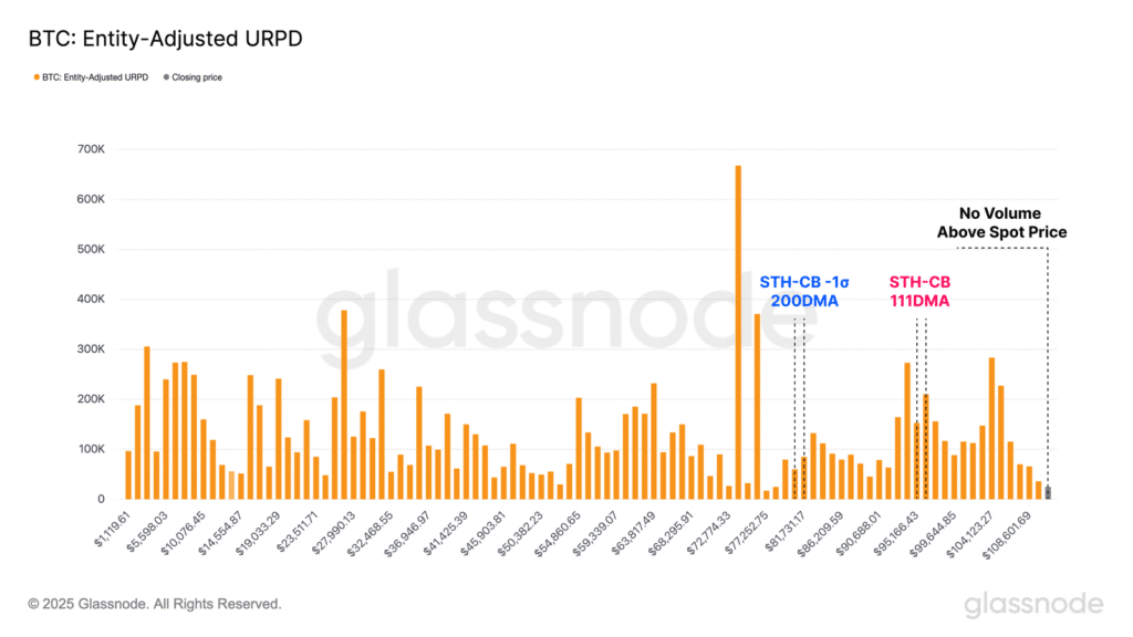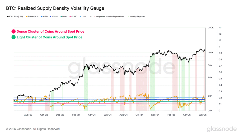 W miarę jak rynek zbliża się do rekordowych poziomów, a sprzedaż wśród Długoterminowych Inwestorów przyspiesza, analiza oczekiwań dotyczących zmienności staje się coraz ważniejsza. Metryka Gęstości Realizowanej Podaży pozwala ocenić, jak mocno skoncentrowana jest podaż Bitcoina o koszcie nabycia bliskim bieżącej cenie na rynku.