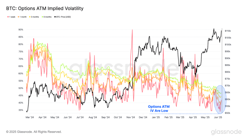 Równolegle rosną oczekiwania co do przyszłej zmienności rynku, co jest napędzane przez silne skoncentrowanie podaży BTC wokół obecnego kursu spot. Takie nagromadzenie zwiększa wrażliwość rynku na wahania cenowe. Mimo to implikowana zmienność opcji pozostaje historycznie niska we wszystkich głównych horyzontach czasowych. To sugeruje, że rynki opcji niedoszacowują prawdopodobieństwo istotnego przesilenia zmienności w okresie letnim.