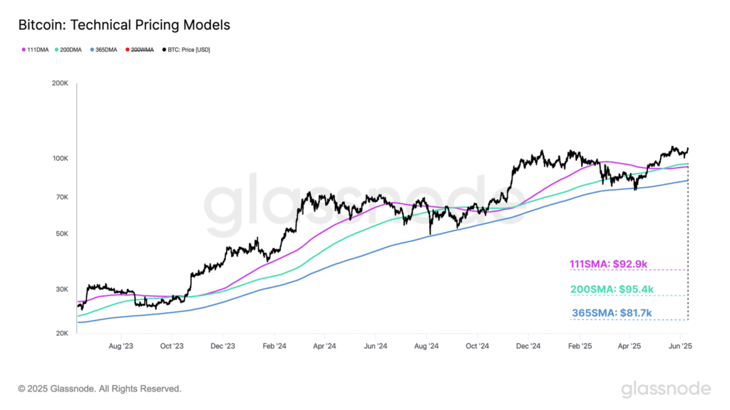 Średnie kroczące z ostatnich 111, 200 i 365 dni od dawna pełnią rolę ważnych barometrów momentum dla Bitcoina — utrzymanie ceny powyżej tych linii jest zwykle sygnałem siły rynku. Obecnie poziomy te wynoszą kolejno: 111DMA – 92,9 tys. USD, 200DMA – 95,4 tys. oraz USD, oraz 365DMA – 81,7 tys. USD.